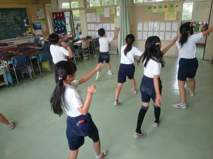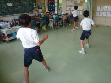 昼休み、3人で運動会の練習をしていたら校庭から戻ってきた子ども達も参加し始めました。(5月20日)