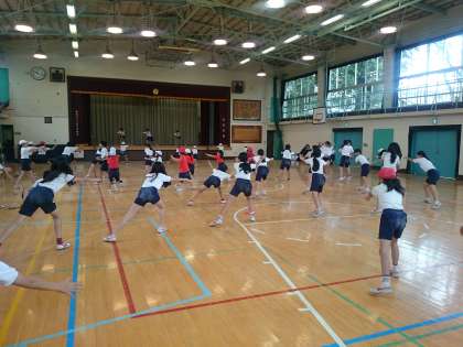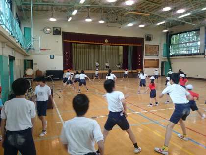 中休みを利用してソーラン節の練習をしました。低学年の子も一緒に踊りを真似していました。(5月25日)