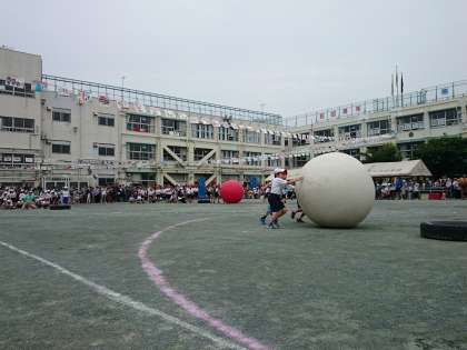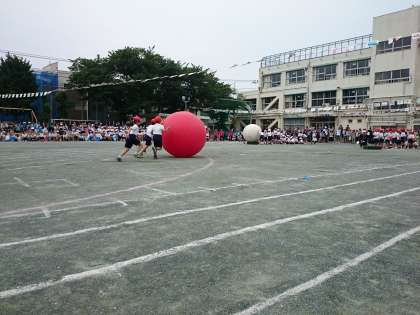 3人の力を合わせてチームワークよく大玉をころがしました。コースから外れないように転がすのがポイントでした。(4月28日)