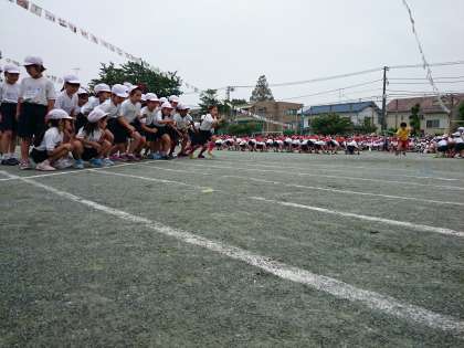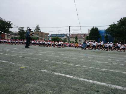 この競技はスタートの合図で綱を引き始めます。応援の人はトラックを半周走って自分のチームに加わります。綱を引く人も応援でかけつける人も力いっぱいがんばりました。(4月28日)