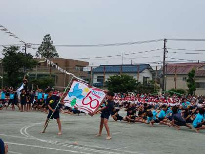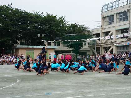 命は海から生まれた。長い時間をかけ、進化し人間が生まれた。人間は海の恵みを求め漁をはじめた。ソーランはニシン漁を表した踊りです。高学年は、命の誕生と力強さを表現します。最初のウエーブは60の人文字です。等々力小の誕生と60年の歩みを表しました。(4月28日)