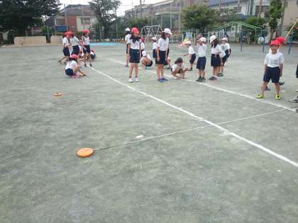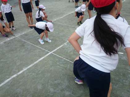 今日は、6年生に手伝ってもらい立ち幅跳びの記録を測定しました。(6月6日)