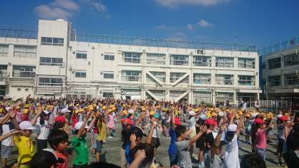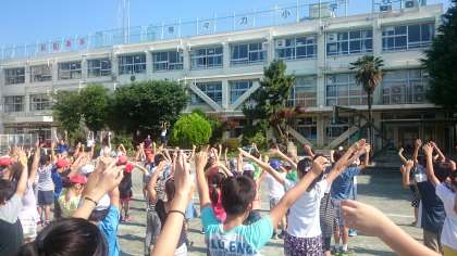 今朝は、児童朝会の前にラジオ体操をしました。(6月27日)