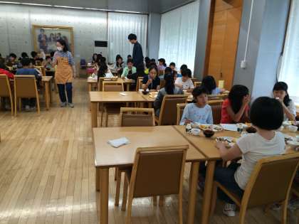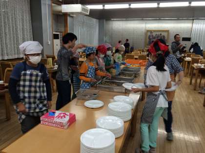 川場移動教室に来て、初めての朝食です。食事係が一生けん命がんばっていました。(6月30日)