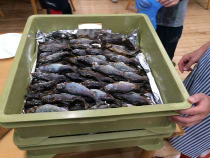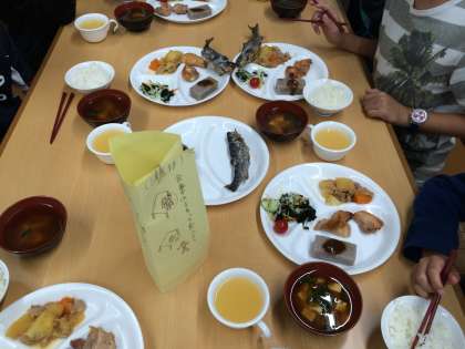 2日目の夕食です。今回も食事係が、頑張っています。先ほど、子どもたちが捕まえたマスの塩焼きも、食卓に上がっています。また、川場村特産のリンゴジュースも夕食に付きました。子どもたちも大喜びでした。(6月30日)