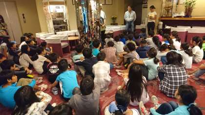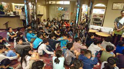 昨日から雨が降っています。室内で朝会を行いました。(8月2日 6時10分)