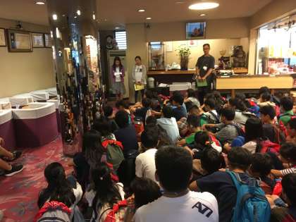 宿舎となるホテル山月に到着し、開室式を行いました。雨の中での到着だったので、ホテルの方が子どもたちの荷物を運んでくださいました。(8月1日 15時45分)