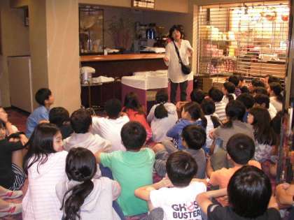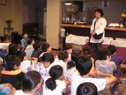 肝試しを始めるために、みんなが集合しました。この後、校長先生から恐い話があり、男女ペアになってお札を取りに行きました。(8月2日 19時)