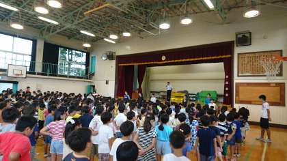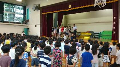今朝は、体育館で行いました。土曜日に行われた水泳記録会で世田谷区の記録を更新した子供たちの紹介がありました。(9月12日)