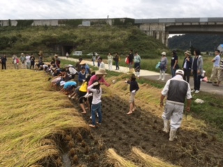 だいたい500平方メートルの水田で、稲刈り鎌で稲を刈りましたが、大変な作業で、子供たちはお米を作るための苦労を体験的に学ぶことができました。また、おいしいコシヒカリのおにぎりやお漬物、豚汁などもごちそうになりました。