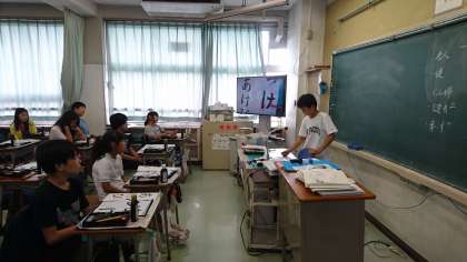 半紙に書いた作品とお手本を見比べ、直す箇所を見つけて発表しました。(10月4日)