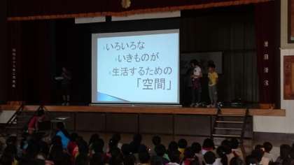 今朝は、体育館で委員会の発表がありました。新しいビオトープも完成して自然を取り戻そうとしています。(10月6日)