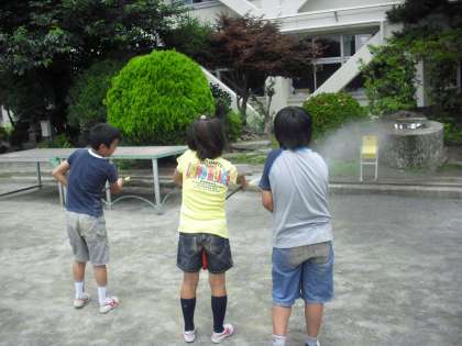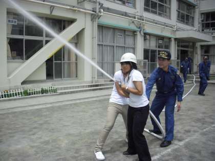 避難訓練の後、初期消火訓練として教師による屋内消火栓訓練、6年生全員による消火器訓練を行いました。