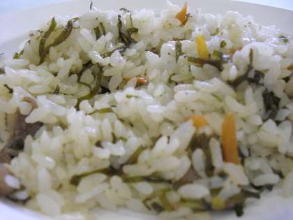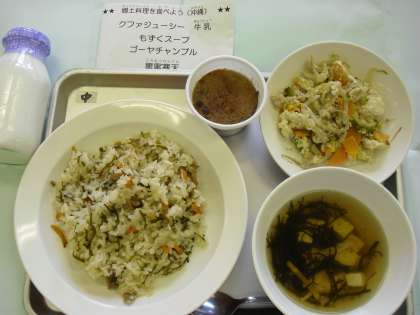 クファジューシー(沖縄風炊き込みごはん) 牛乳 もずくスープ ゴーヤチャンプル
