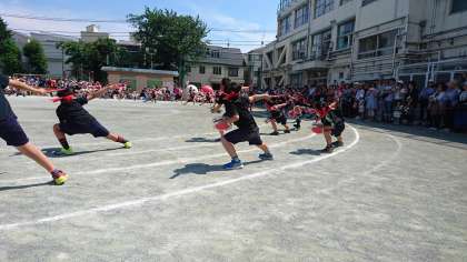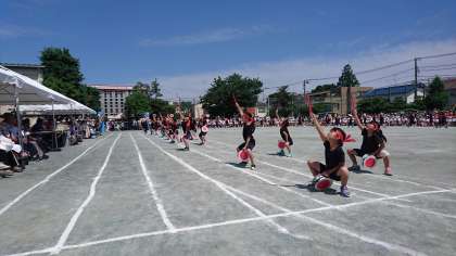エイサーは、沖縄県の民舞です。手をふり上げてたいこをたたき、力強く踊りました。腰をおとし、足を大きく広げながら前後にまわる動きを何度も練習しました。(5月27日)