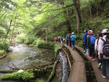 雨も上がり、竜頭の滝から湯の湖までのハイキングに出発しました。寝不足で疲れ気味でしたが、素晴らしい自然の中を歩きました。(7月24日)