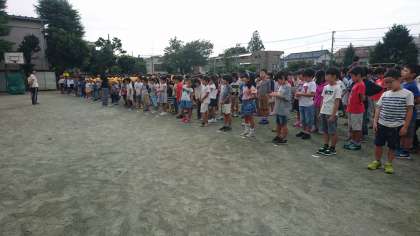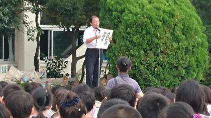 工事や暑さの関係のため、二学期初めての校庭で児童朝会が行われました。校長先生からはことわざについて話がありました。(10月2日)
