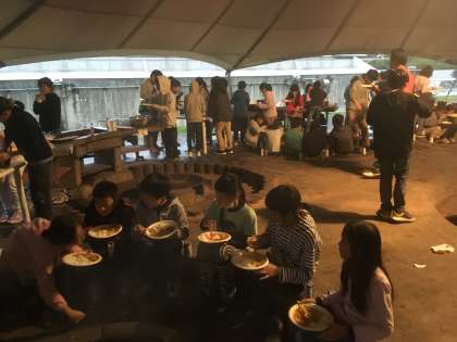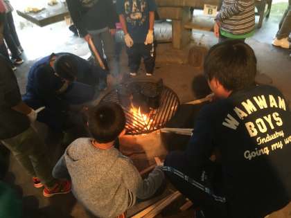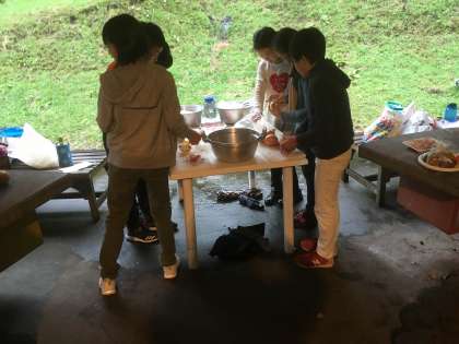 川場移動教室1日目の楽しみの一つである飯盒炊爨をしました。雨のため、たき木が湿っていて火をつけるのに、少し苦労しましたが、一生懸命がんばって何とかご飯を炊き、カレーを作ることができました。野菜や肉などを切るのも協力してできました。