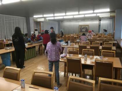食事係とお手伝いの子で、朝食の準備をしています。(10月18日)