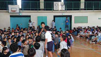 今日の集会は、イントロあてクイズをしました。子どもたちが運動会で歌っている応援歌が流れると大きな声で続きを歌っていました。(10月26日)