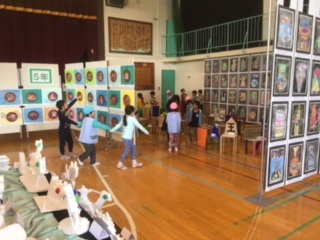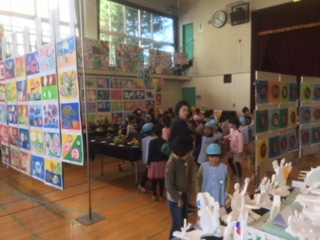 等々力小学校で行われているとどろきフェスタ(展覧会)に、みしまの森学舎の三島幼稚園の年長組の子たちが鑑賞に来ました。等々力小学校の1年生が、一生懸命、展覧会の会場を案内しました。幼稚園児たちも、初めて見る展覧会をとても楽しんでいました。「楽しかった。」「すてきな作品がたくさんあった。」という声をたくさん聞くことができました。(11月17日)