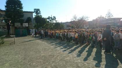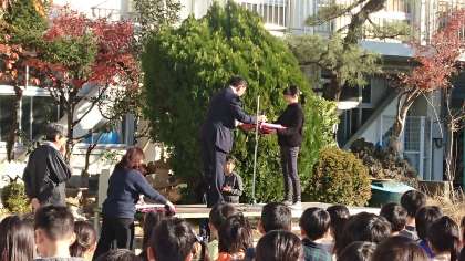 今朝は、校庭先生の話の後に表彰がありました。(11月27日)