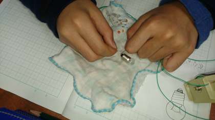 豆電球の明かりを付けるためにはどこに電池をつなげばいいのか自分の予想を確かめていました。(11月27日)