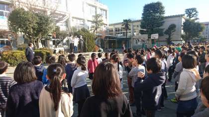 みんなに牛乳を残さずに飲んでもらおうとキャラクターを見せながら話をしていました。(12月18日)