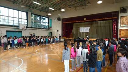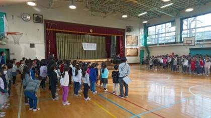 今朝は、低学年の音楽朝会がありました。3月に行われる6年生をおくる会の歌を練習しました。(2月1日)