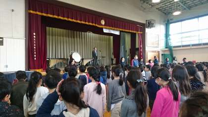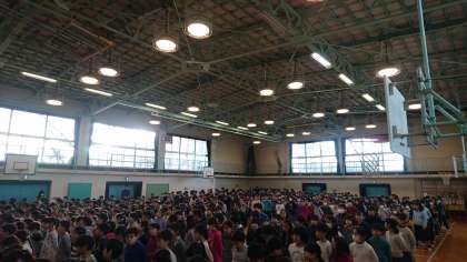 今朝の体育館はとても冷えていました。校長先生の話は、は、オリンピックの話でした。(2月5日)
