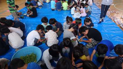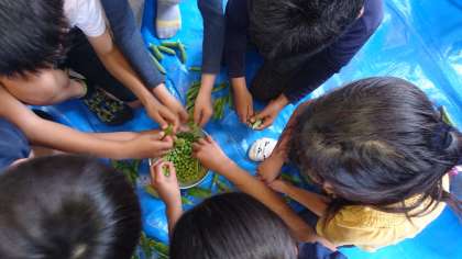 今日の給食の食材であるグリンピースの皮むきをしました。子どもたちにとって初めての体験で、たくさんあったグリンピースもあっという間に終わってしまいました。(5月2日)