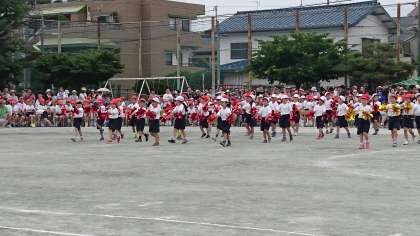 「ドラえもん」の曲がかかると、思わず歌いはじめる1年生です。大好きな曲で元気いっぱいおどりました。(5月26日)