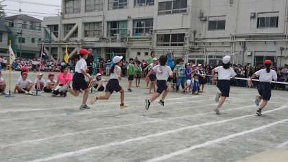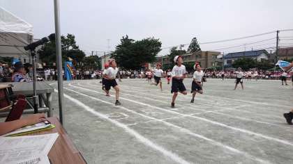 高学年の仲間入りをした5年生122名。種目名「レッツゴー!」のように、5年生は学習や行事を前向きに取り組んでいます。この徒競走も全力で走りきりました。(5月26日)