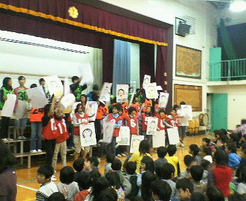 勤労感謝の日にちなんだ、似顔絵集会です。ギッズ班で高学年がリードしながら先生や主事さんの似顔絵を描いていきました。