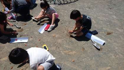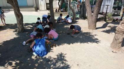 晴れていたので、日なたと日かげによる地面の違いを温度計を使って測定しました。(6月1日)