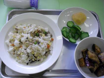 ☆献立☆ チャーハン・牛乳・大学いも・きゅうりのひとしお・柿