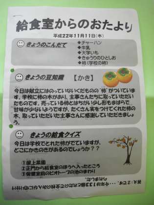 今日は11月の献立表にはのっていないくだもの”柿”が給食に出ました。この柿は、等々力小学校の敷地内にある柿の木から主事さんにとっていただいたものです。毎年秋になるとたくさんの実をつけてくれます。今年は、133個収穫できました。全校のみんなでおいしくいただきました。