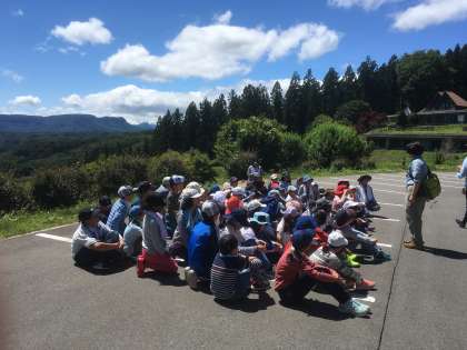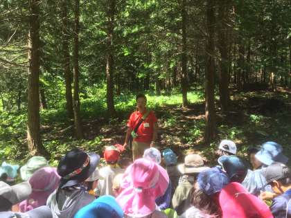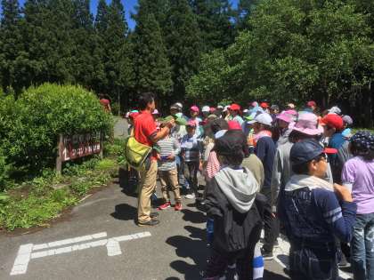 開室式の後、 川場村の自然を知ろうという 里山入門プログラムを体験しました。宿舎の方から、川場村の自然や動物、植物についての説明を聞きました。子供たちは、興味津々で聞き入っていました。川場村の自然の様子について思いを巡らしました。(6月13日)