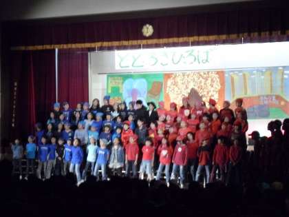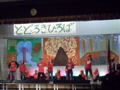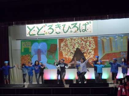 ミュージカルに挑戦しました。11曲もの歌と8曲の踊り・台詞を一生懸命に覚えました。大きな板段ボールに自分たちが考えた背景の絵(ビルの団地・広場・公園・大きな木)を、放課後遅くまで残り、協力し合って仕上げました。レッドイーグル団とブルーシャーク団と緑の旗は、学年全員が描いた中から投票で選ばれた人のデザインで作りました。「とどろきひろば」の看板も、子どもの手作りでした。休み時間には、ダンスの上手な人がまだ覚えていない人に積極的に教えてあげていました。