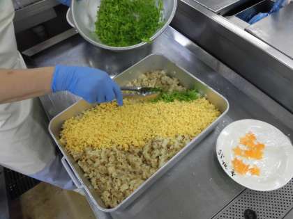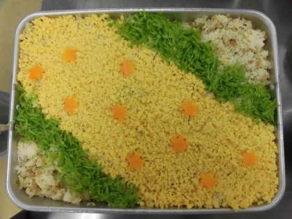 大変な作業でしたが、調理員さんたちが力を合わせて飾りつけてくれました。