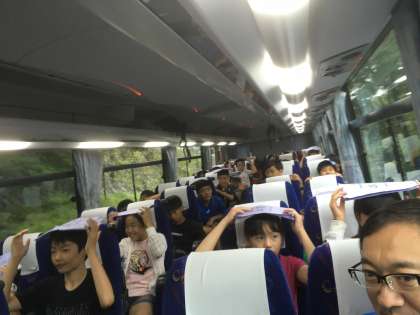 お世話になったホテル山月の方たちにお礼を言ってお別れし、日光江戸村に向かっています。バスの中では、バスガイドさんから、いろは坂の話など日光の話を聞きました。(8月8日)