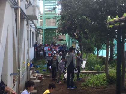 毎年、この時期に行っている「築山清掃」を5年生が行いました。「築山清掃」は、夏の間に茂ってしまった雑草を抜いて学校の環境を整備する奉仕活動です。大人の人たちに負けないくらい、5年生も暑い中がんばって、学校の環境整備に取り組んでくれました。(9月8日)