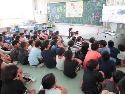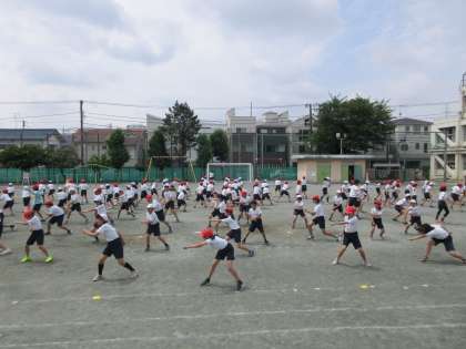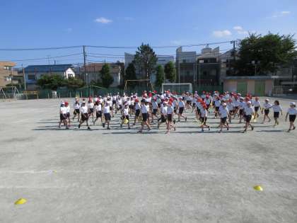 令和元年度運動会に向けて、6年生の表現では、「ダンス・集団行動・旗を使ったマスゲーム」で構成しました。ダンスの曲や振り付けは子どもたちで考案しました。集団行動では、拍に合わせて歩幅を揃えながら歩く練習を重ねました。練習後は録画をした映像を見て課題を見つけていきました。