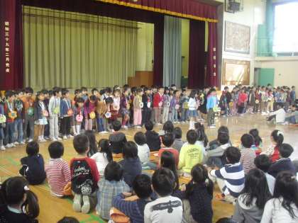 一年生も学校クイズでは、先生クイズや学校のルールクイズを楽しんでいました。先生たちは変装をしたり、代表委員の子たちのパフォーマンスで会場を沸かせたりするなど全校児童が楽しめた会になったのではないでしょうか。
