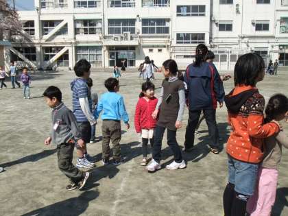 また、一年生を迎える会の後は6年生と一緒に校庭で遊びました。一年生を気遣い優しく接する6年生の心配りが立派でした。等々力を支える最上級生として一層頼もしく感じた1時間目でした。