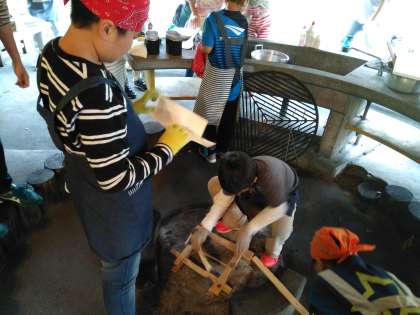 飯盒炊さんに取り掛かりました。火起こしや調理のポイントを教わり、班で協力しています。