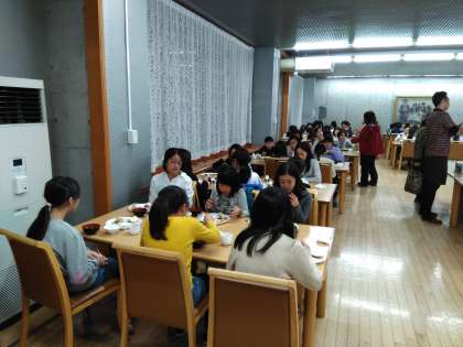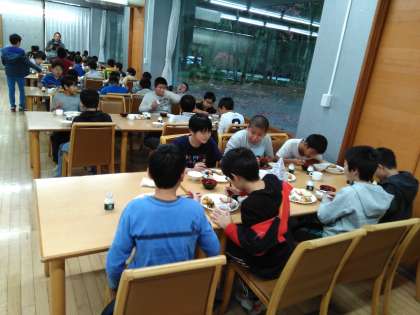食事係が協力して、朝食の準備をしました。学校での当番活動が生きています。
