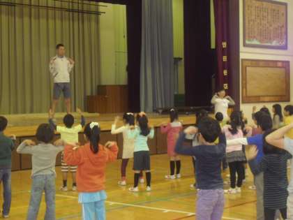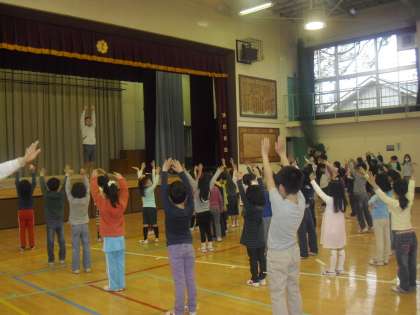等々力小学校では、毎月1回ラジオ体操の日を設けています。4月は19日に行いました。たくさんの子が参加し、心地よい汗を流すことができました。1学期は、5月19日(木)、6月20日(月)、7月14日(木)を予定しています。
