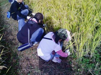 慣れない手つきですが、稲刈りに挑戦しました。