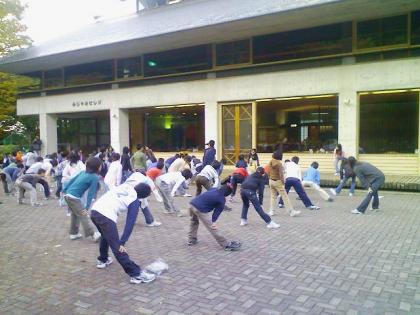 朝会、体操の様子です。これから朝食そしてハイキングに行きます。快晴!
